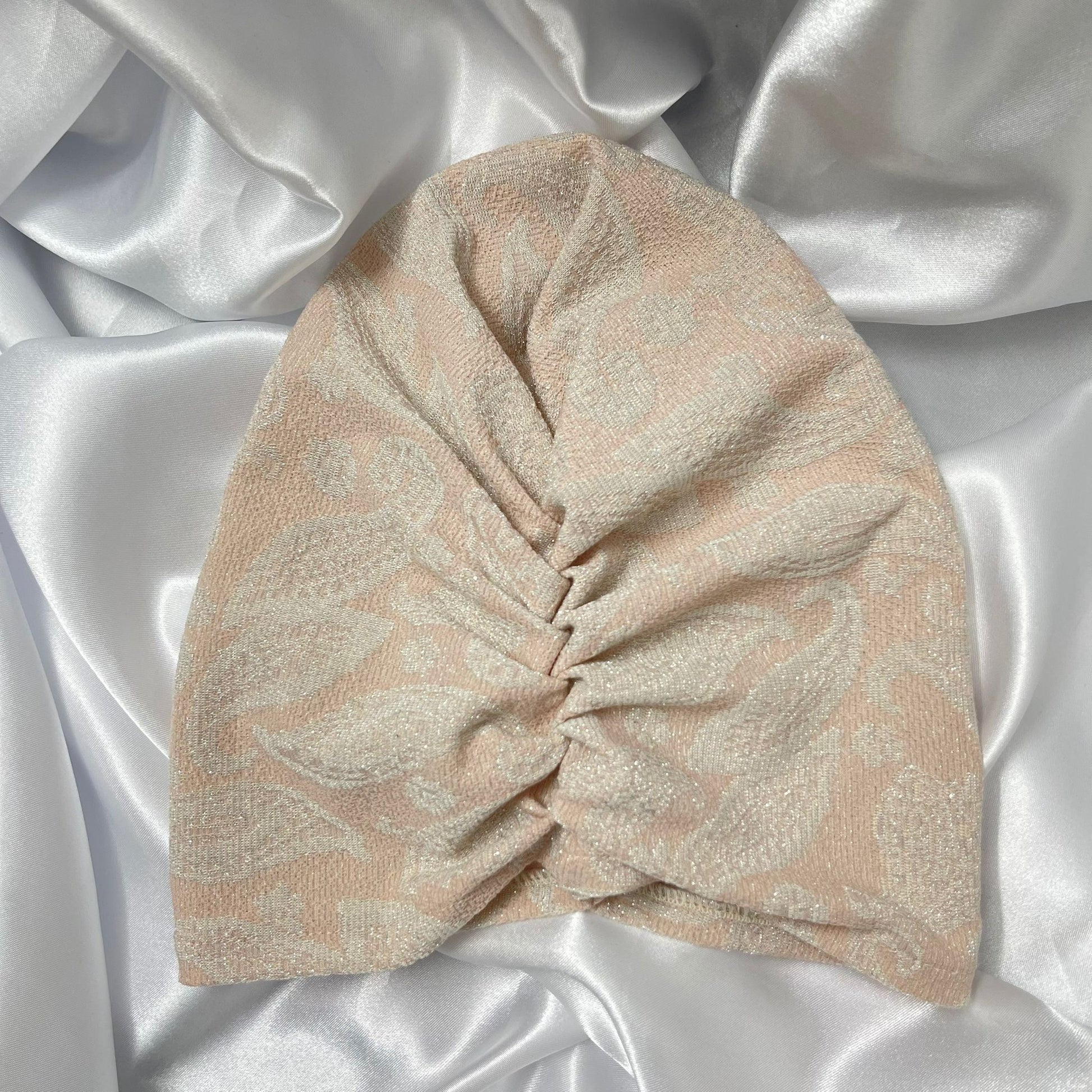 טורבן סריג בגוון פודרה עם עיטורים בצבע שמנת נצנץ כולל גומיה תואמת
