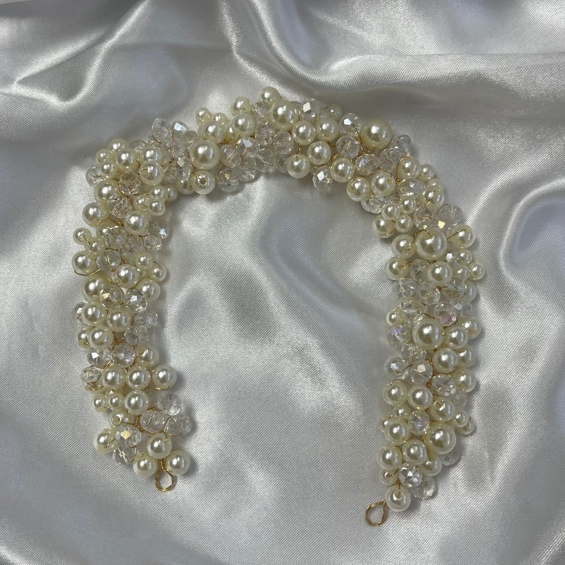נזר פנינים עם שיבוץ אבנים על בסיס זהב מגיע עם סרט קשירה