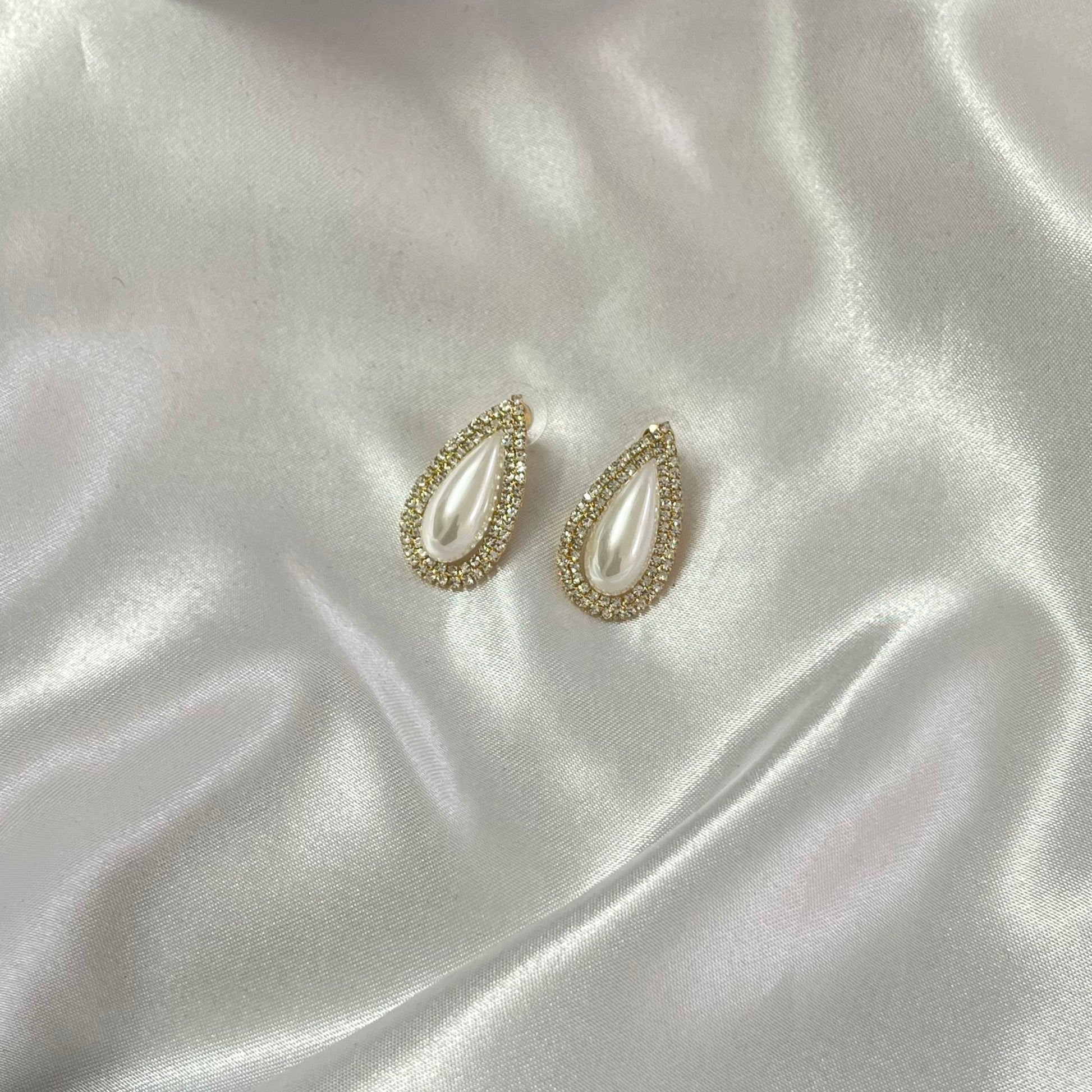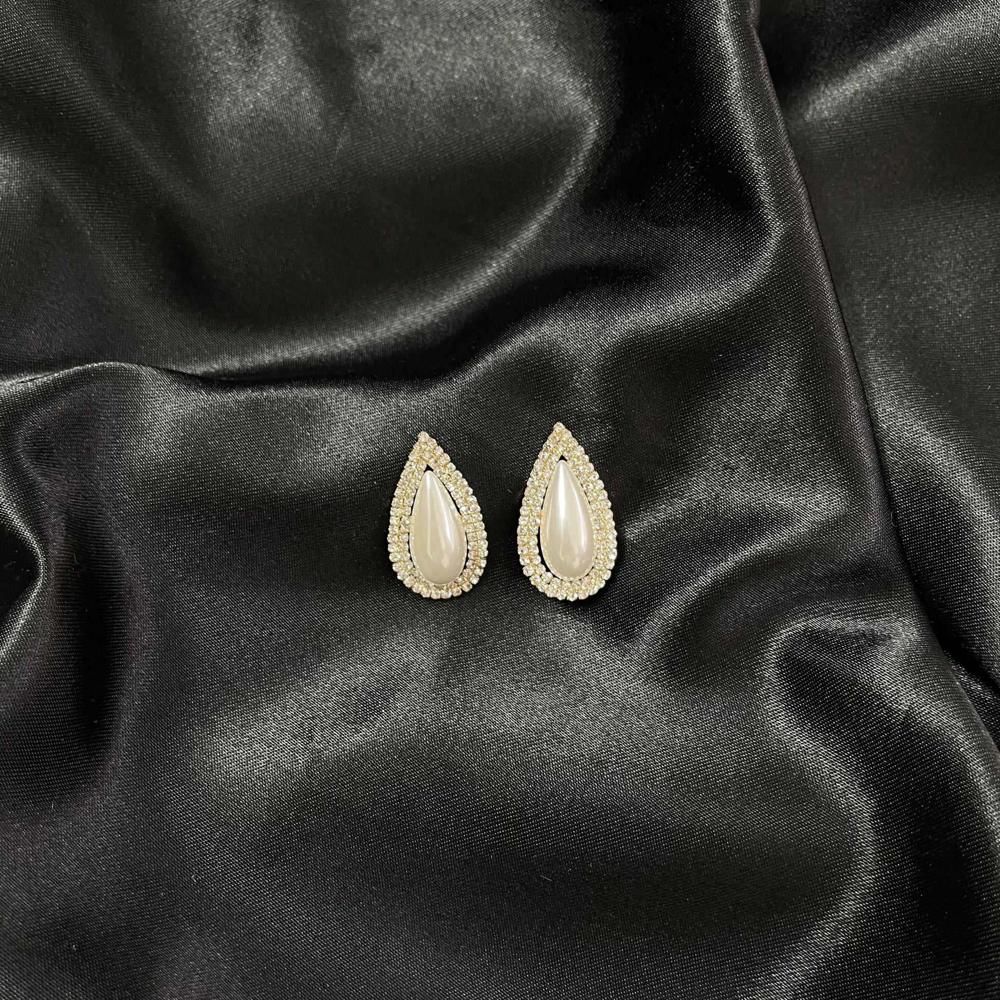 עגילי טיפה פנינה מסגרת משובצת אבנים בצבע זהב