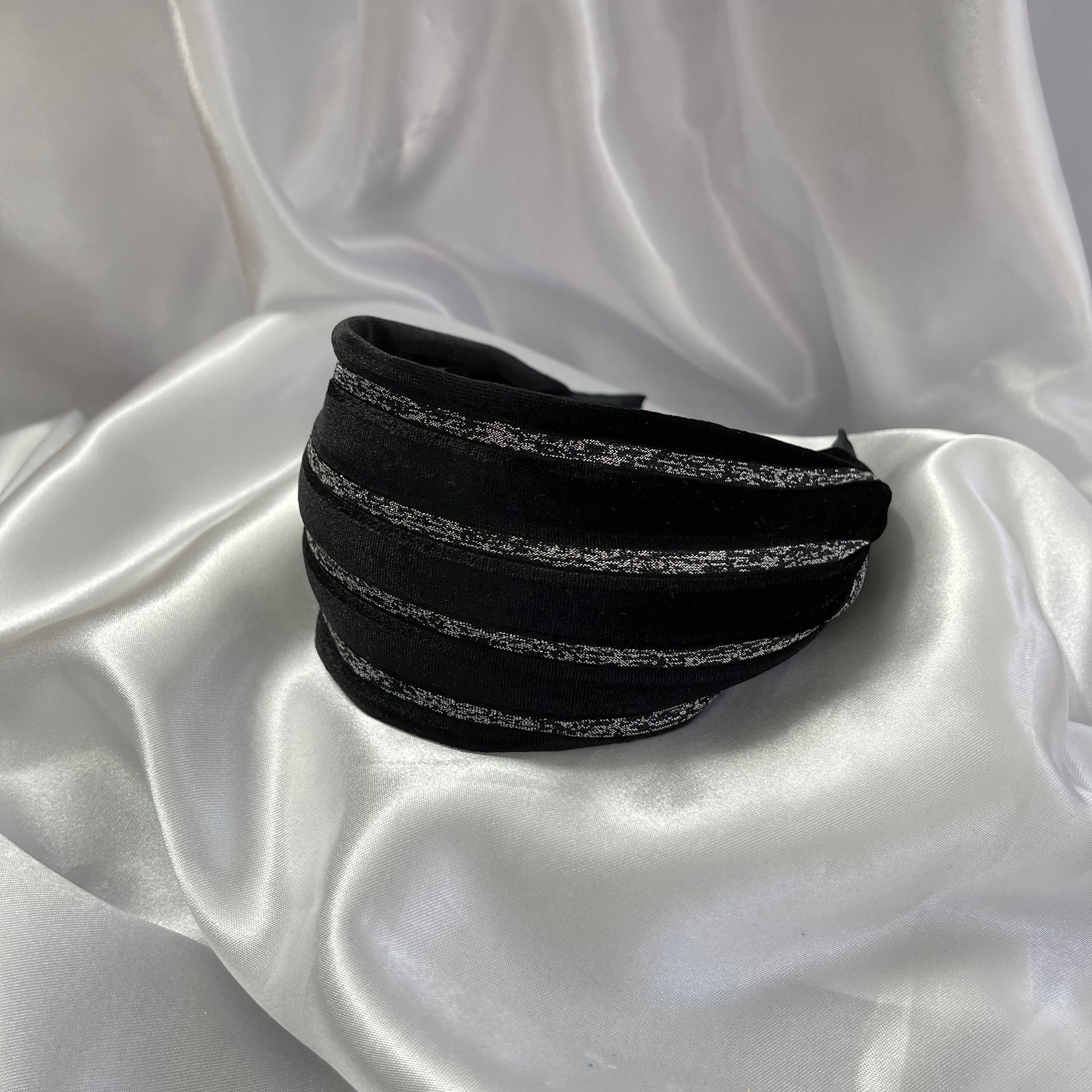 קשת קטיפה שחורה עם פסים כסופים
